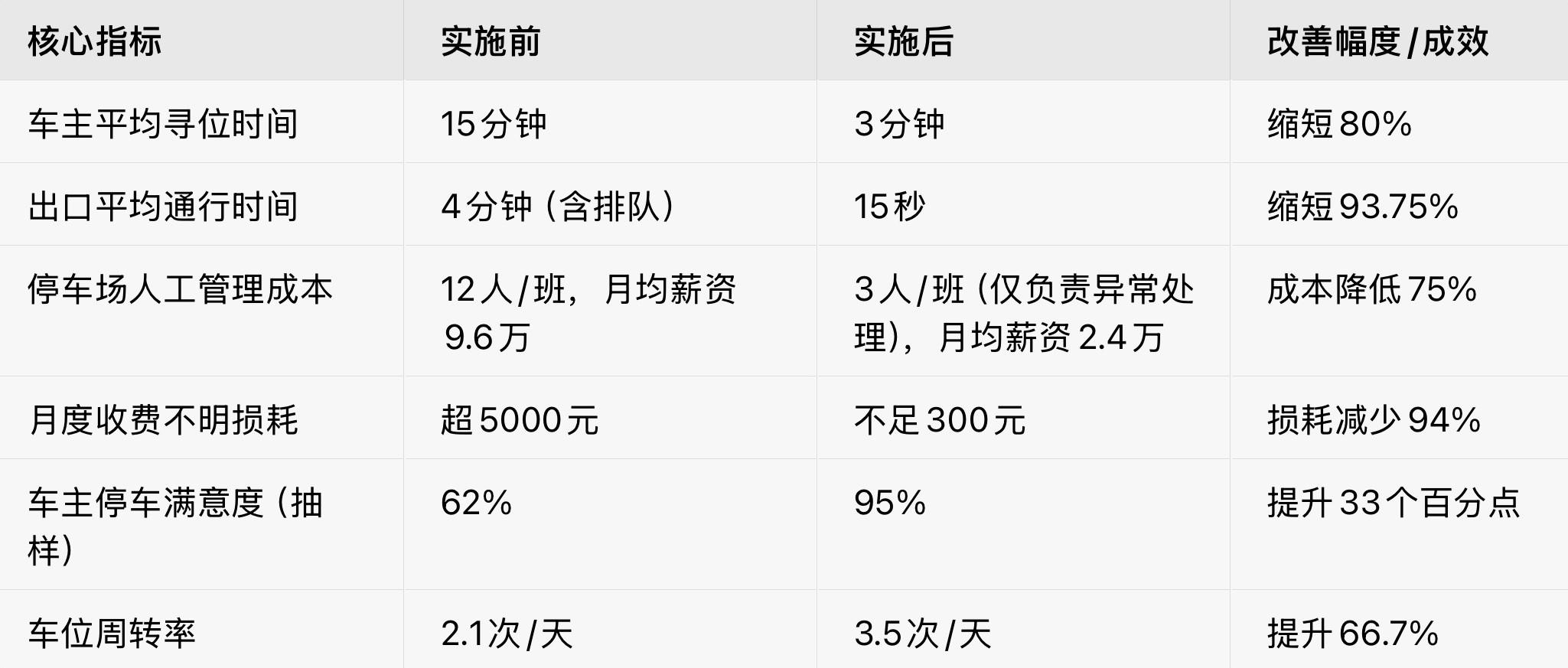 商业价值延伸:系统与综合体会员系统打通,车主消费可兑换停车时长、积分抵扣停车费,间接带动商场餐饮、零售业态消费转化,实施后月度会员复购率提升18%。