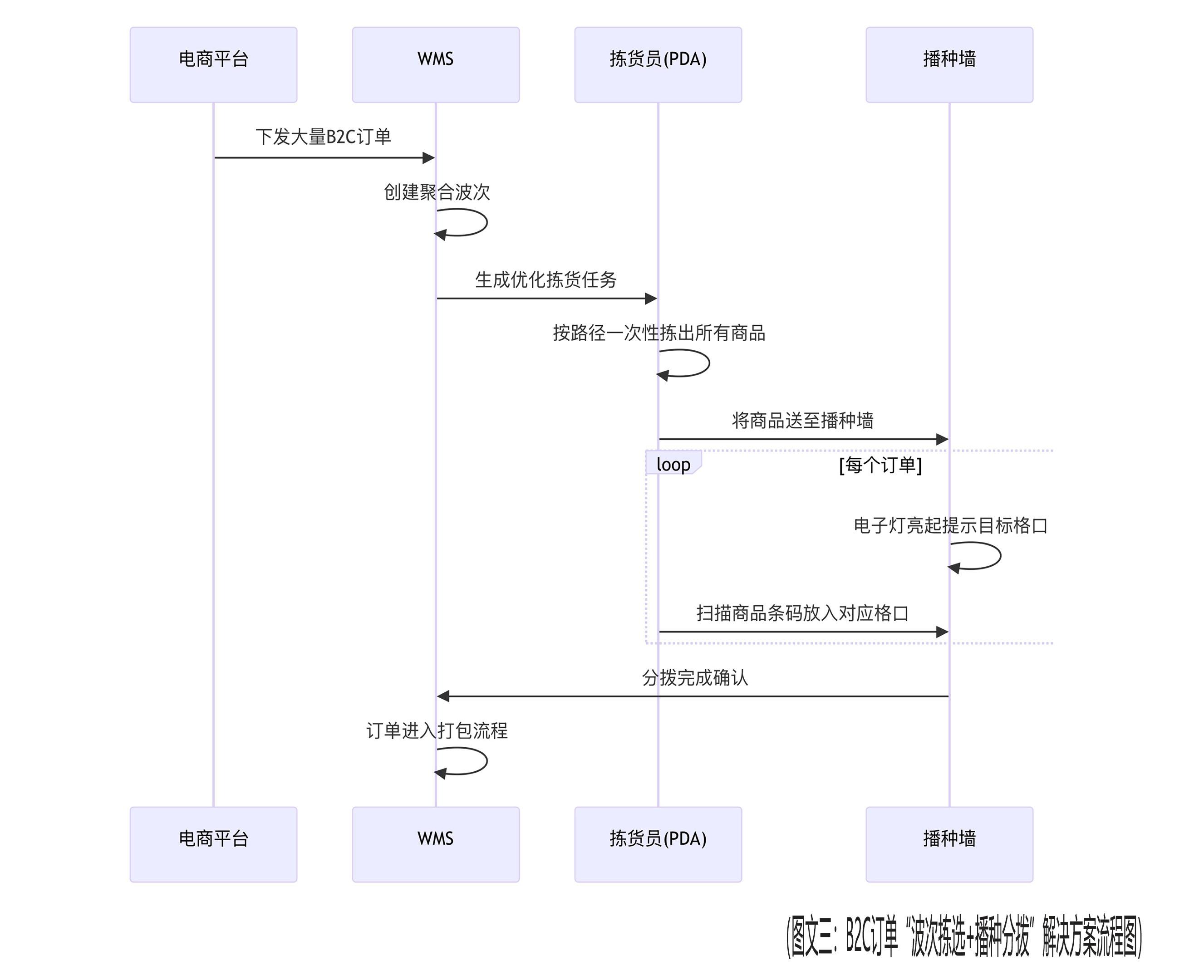 图示:此方案将“边拣边分”改为“先总拣再分播”,极大提升了海量B2C订单的处理效率和准确率。